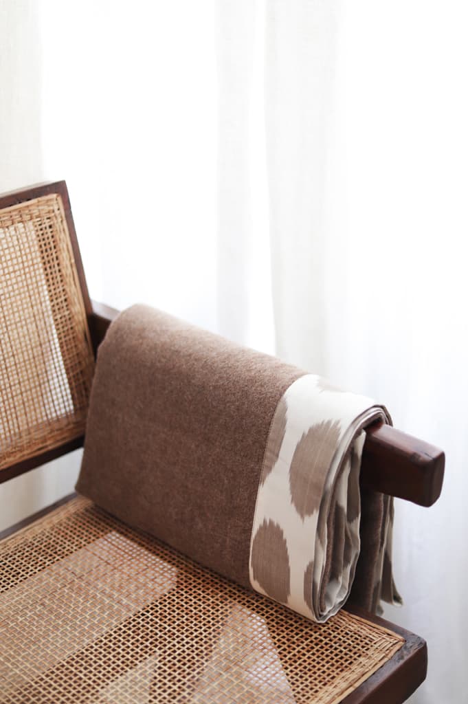 A beautifully soft throw from 100% Peruvian baby alpaca featuring a delicate silk border in the central-Asian traditional Ikat motif.