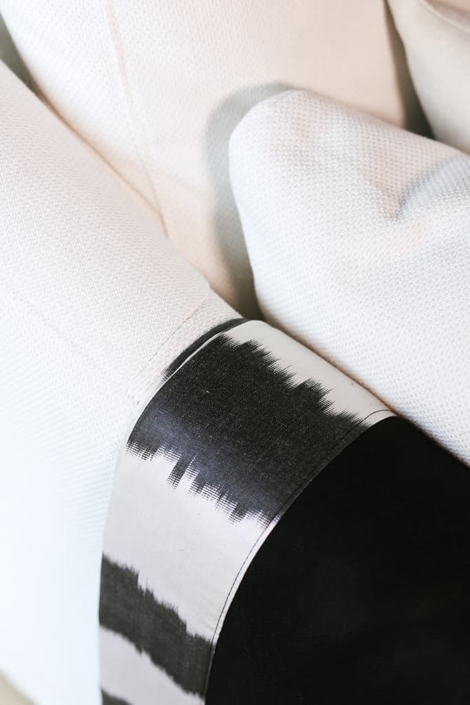 The Ikat silk applied to this throw has been handloomed in Bukhara (Uzbekistan) by experienced weavers using traditional techniques.