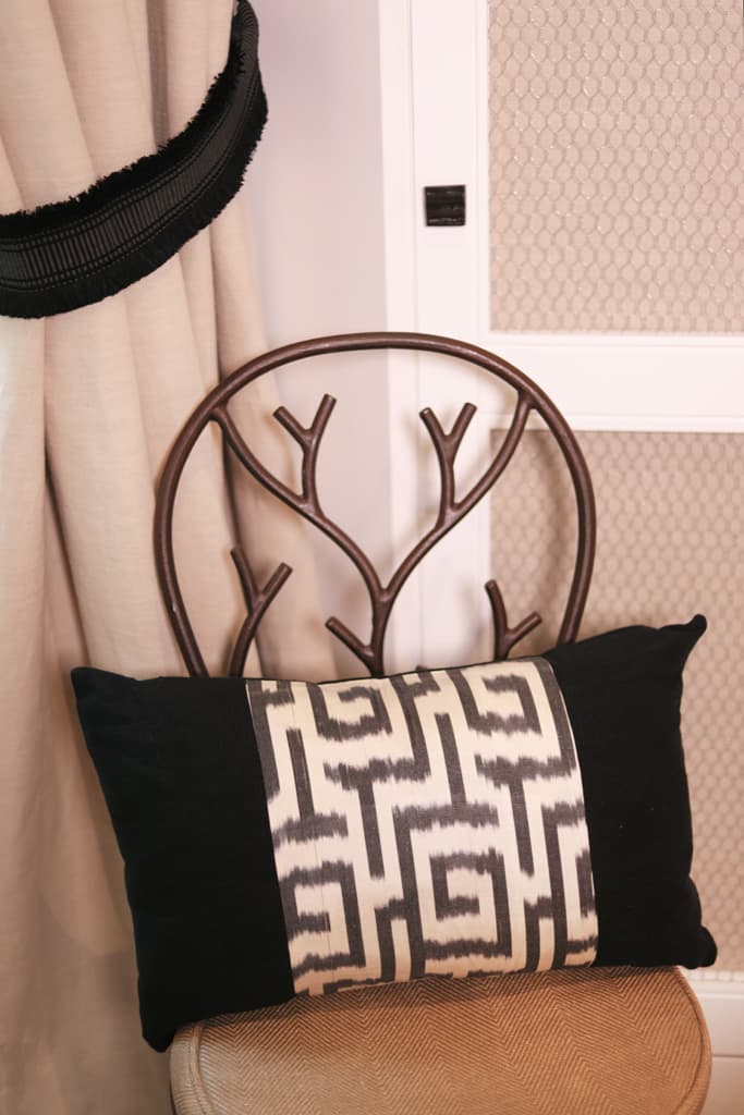 This highly decorative cushion features a fringe of 100% Ikat silk applied on soft pure linen.