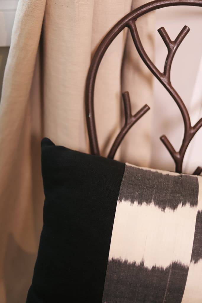 The Ikat silk applied to this cushion has been handloomed in Bukhara (Uzbekistan) by experienced artisan weavers using traditional techniques.