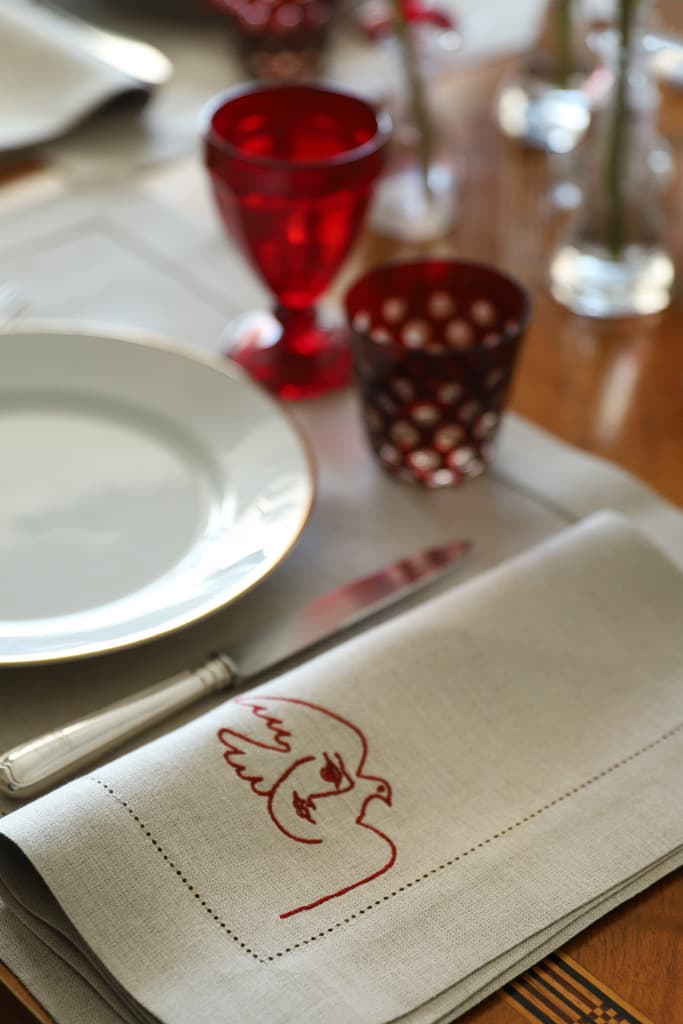 Each extra-large napkin features an embroidered motif inspired by Pablo Picasso’s “Visage de la Paix”, a series of drawings made by the artist in the early 50s.