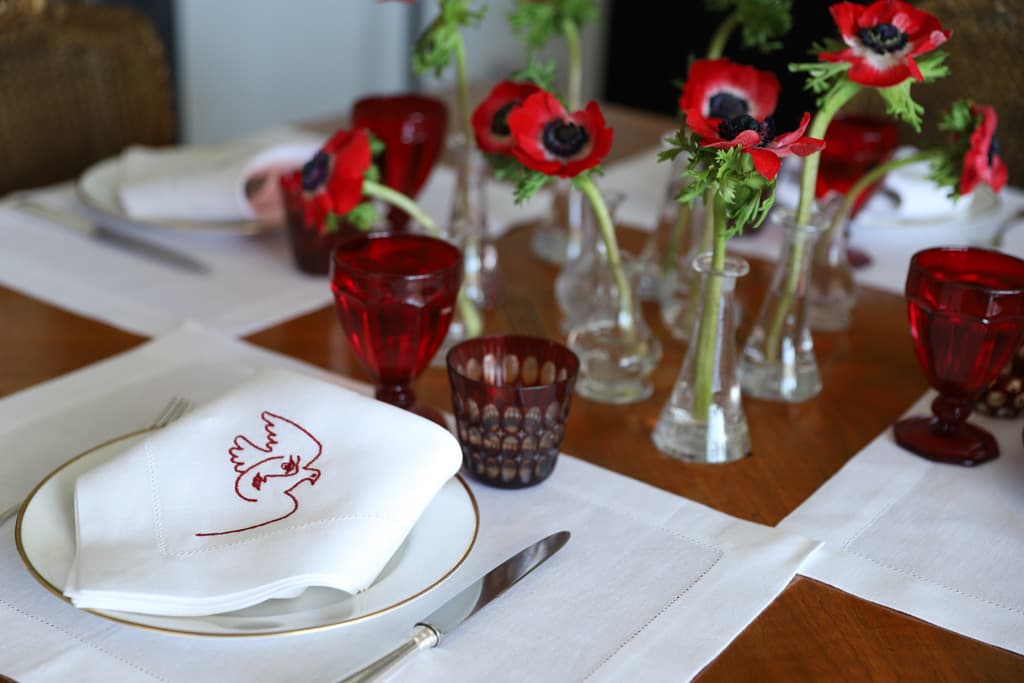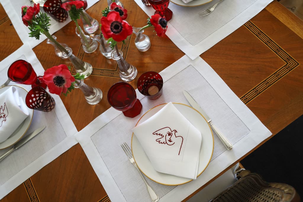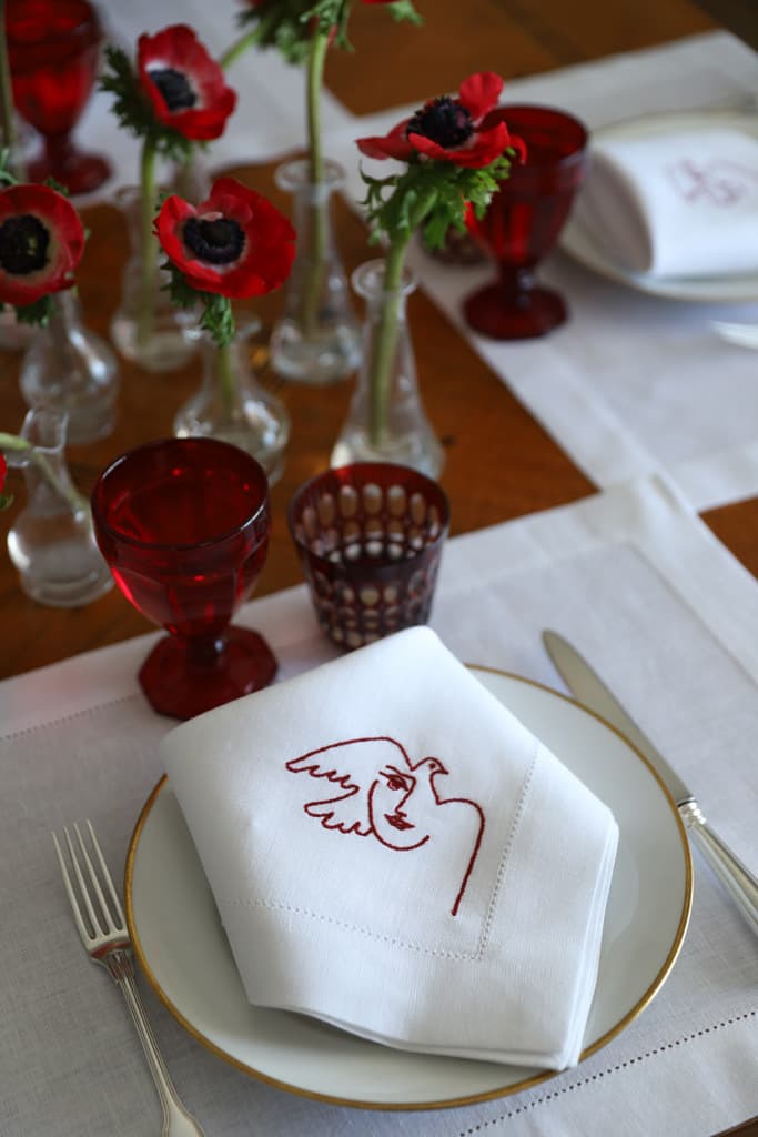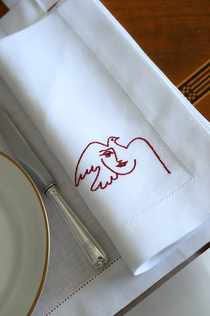 Each extra-large napkin features an embroidered motif inspired by Pablo Picasso’s “Visage de la Paix”, a series of drawings made by the artist in the early 50s.