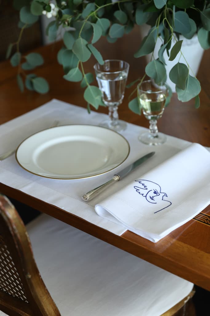 Each extra-large napkin features an embroidered motif inspired by Pablo Picasso’s “Visage de la Paix”, a series of drawings made by the artist in the early 50s.