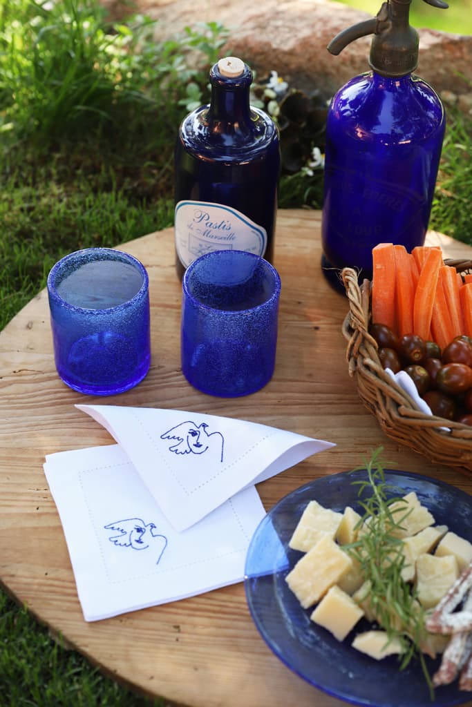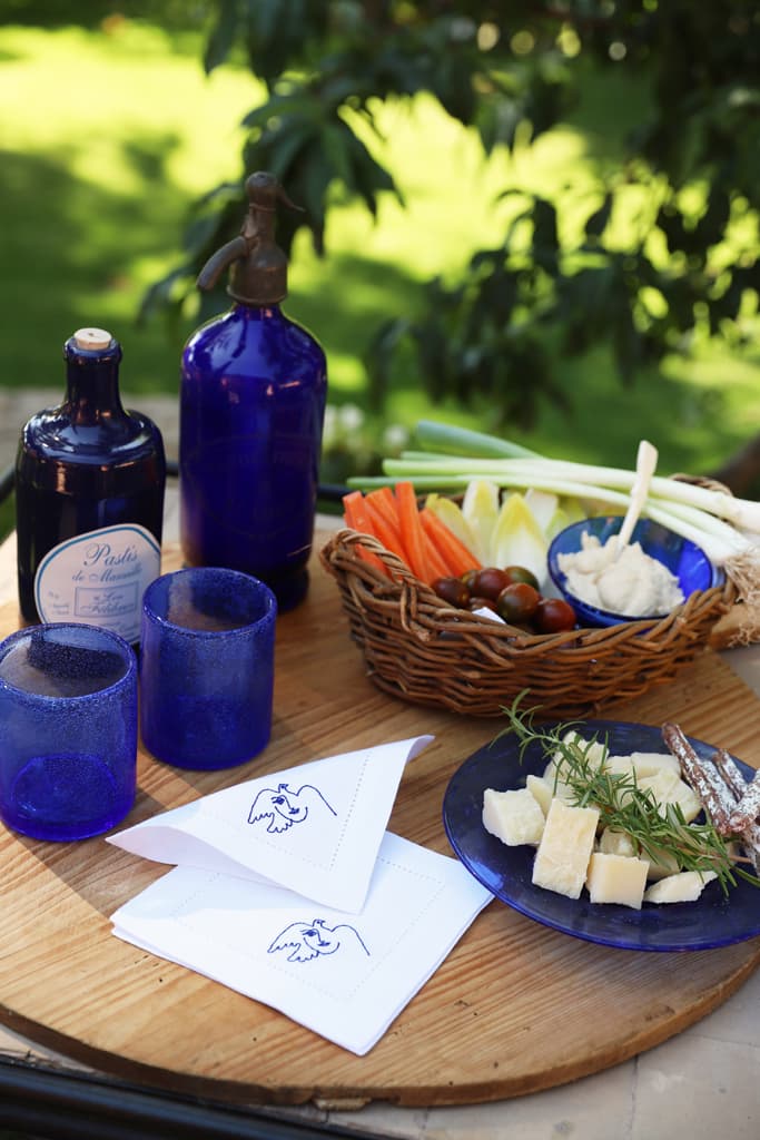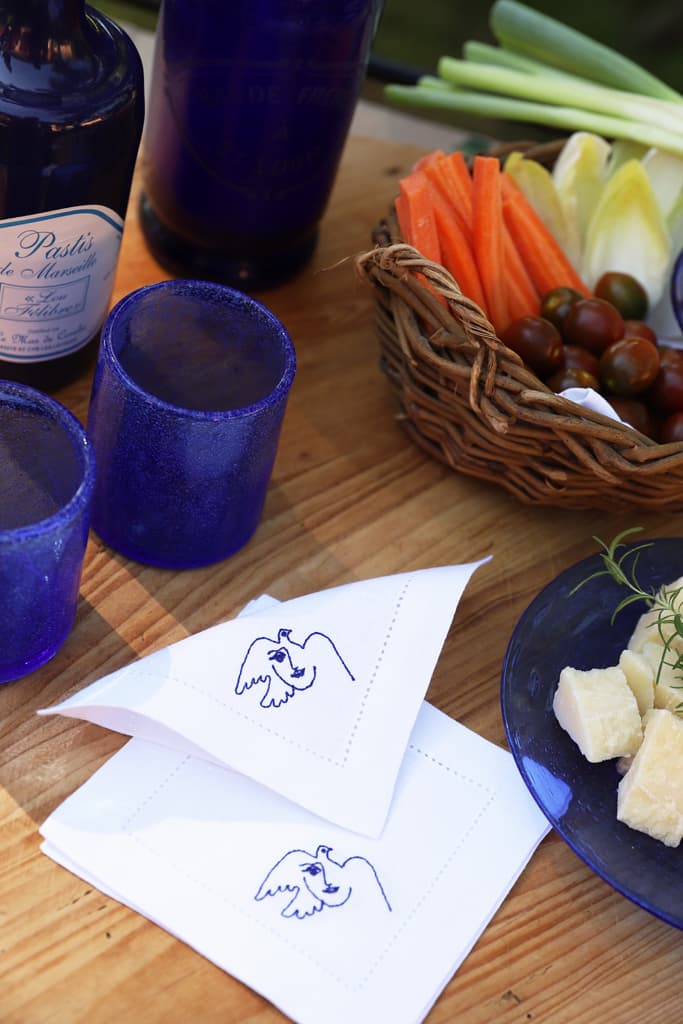 Each cocktail napkin features an embroidered motif inspired by Pablo Picasso’s “Visage de la Paix”, a series of drawings made by the artist in the early 50s.