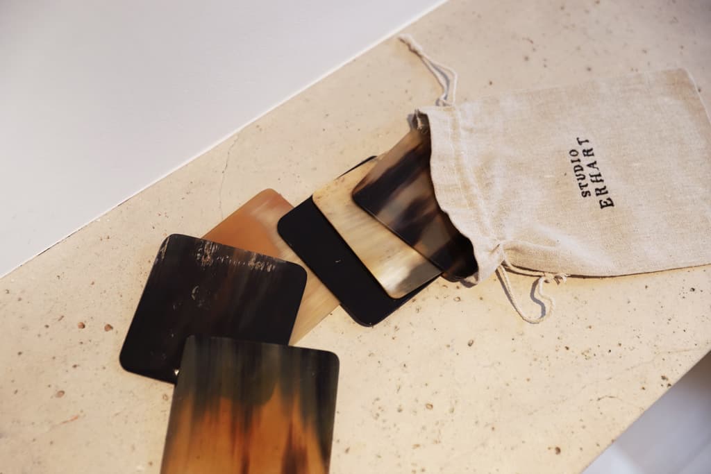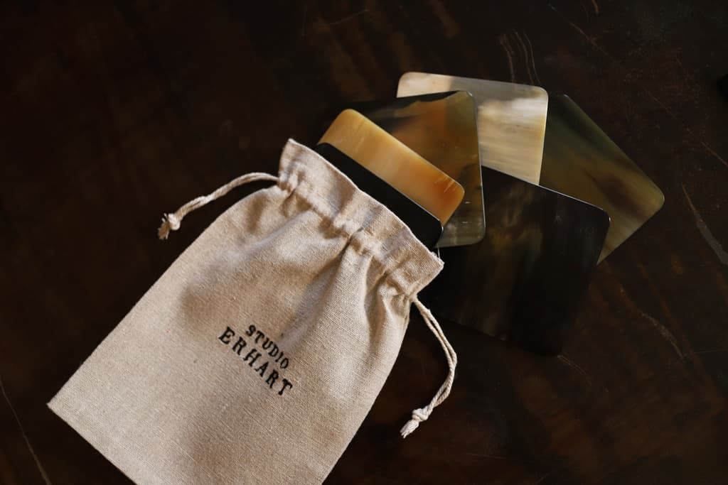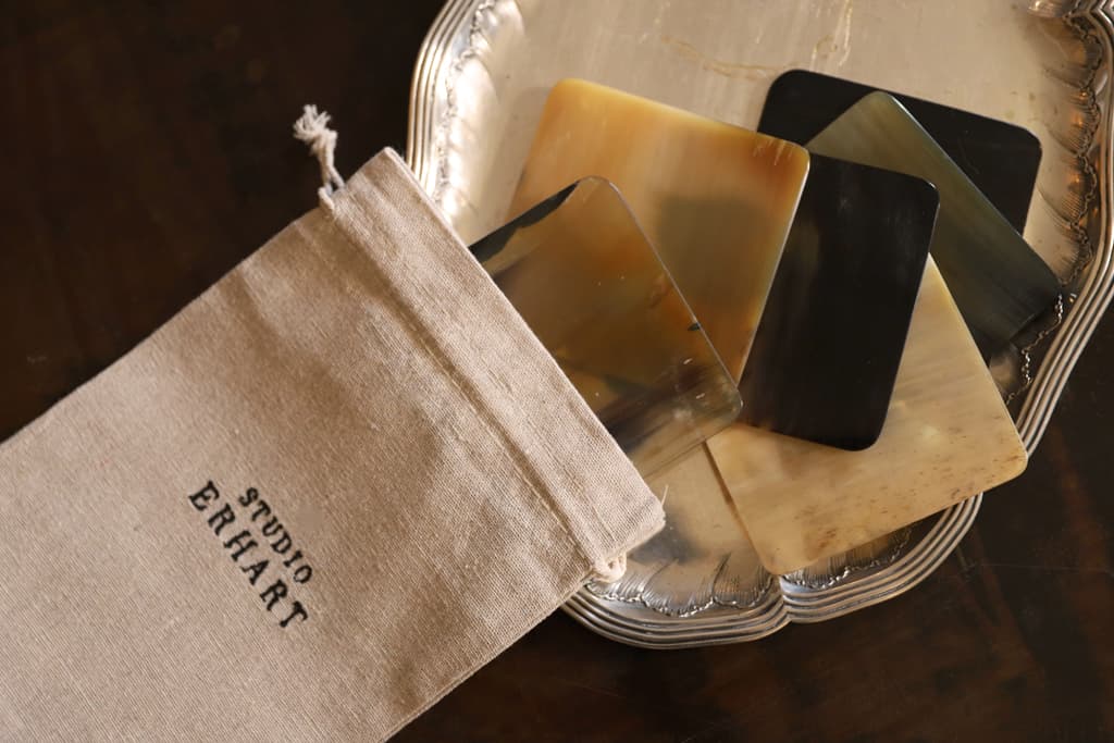 The horn of each coaster has been selected by our artisans, who polish each coaster to bring the natural sheen to the surface, contributing to the unique and luxurious quality of this product.