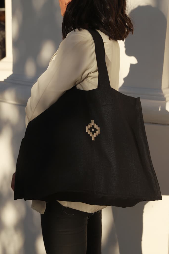With a handy side pocket on each side, it features a beautiful embroidered symbol of the Mapuche, a group of indigenous inhabitants of southwestern Argentina, giving the design an ethnic feel.