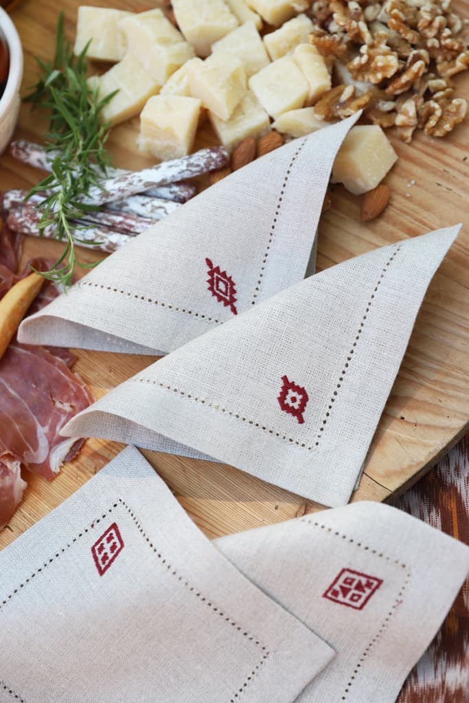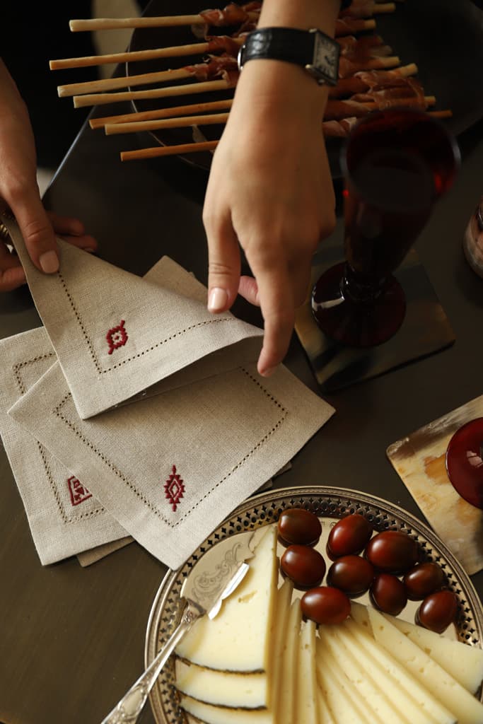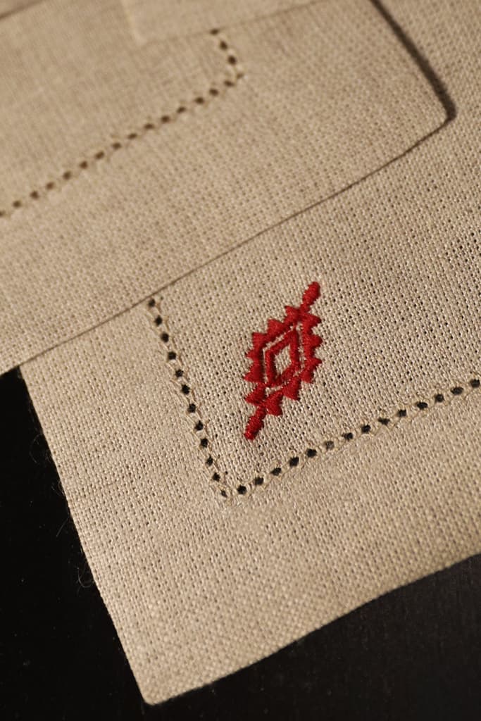 Each cocktail napkin features an embroidered symbol of the Mapuche, a group of indigenous inhabitants of southwestern Argentina, giving the design an ethnic feel.