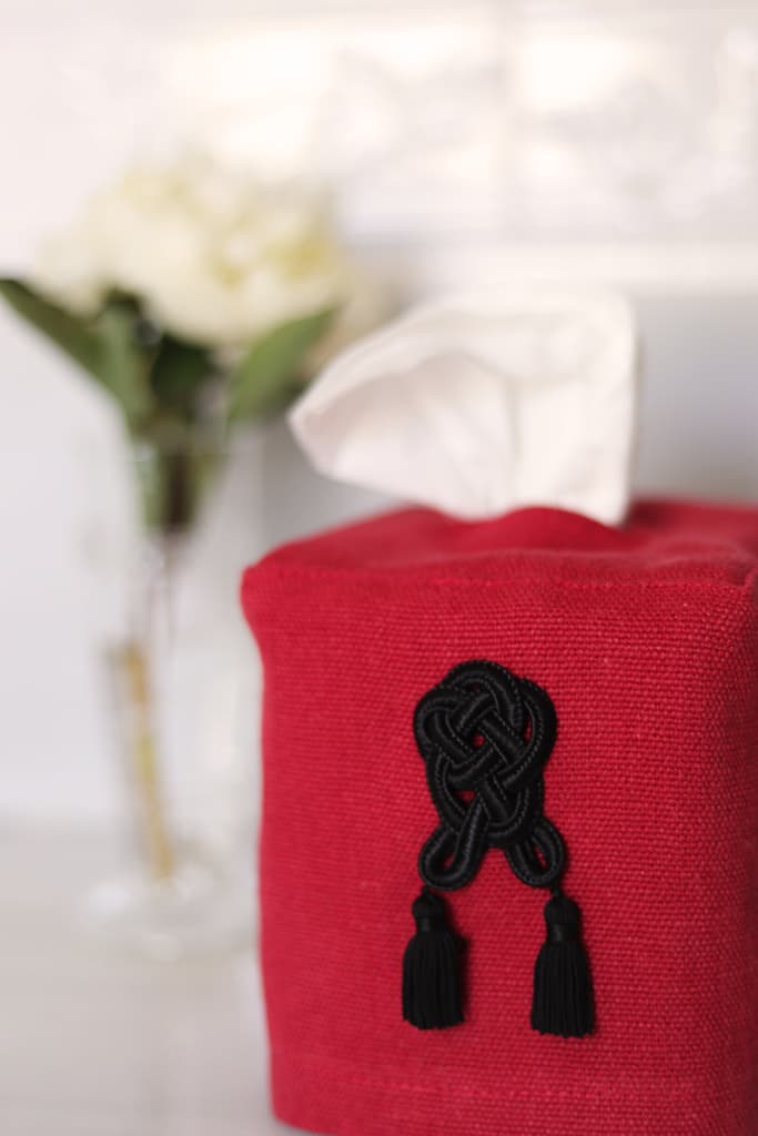 The braiding motives at the centre of this tissue box cover are handcrafted by a family-owned company that is devoted, since the 19th century, to the art of making torero costumes and other traditional Spanish clothing.